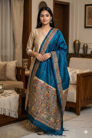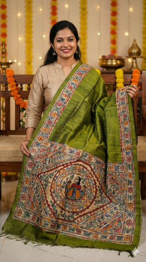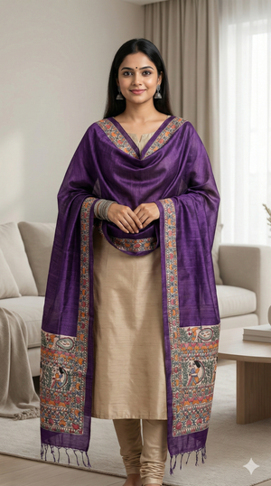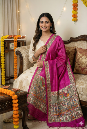Madhubani painted dupattas are a graceful extension of Mithila folk art, where storytelling traditions move from walls and paper onto flowing fabric. Each dupatta in this collection is individually hand-painted, preserving the symbolic language, disciplined line work, and rhythmic patterns that define classical Madhubani painting.