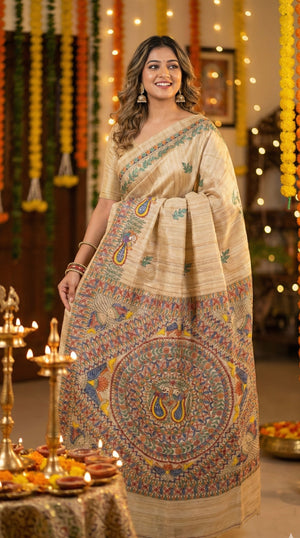 - Pure Tussar Silk (Desi Tussar) – rich texture with a natural sheen