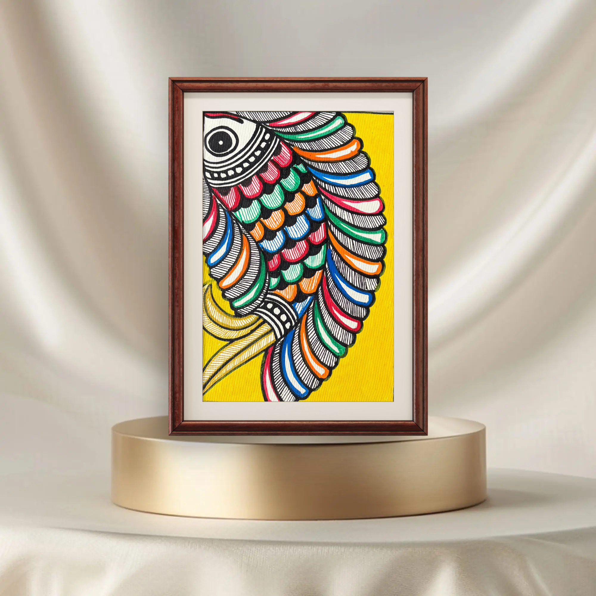 The artist has highlighted a single majestic fish in bold, colorful strokes against a radiant yellow background, creating a striking visual contrast. Each scale is meticulously detailed with rich hues of red, blue, green, and orange, reflecting the traditional vibrancy of Madhubani painting. The composition is simple yet powerful, blending symbolism with modern appeal.
