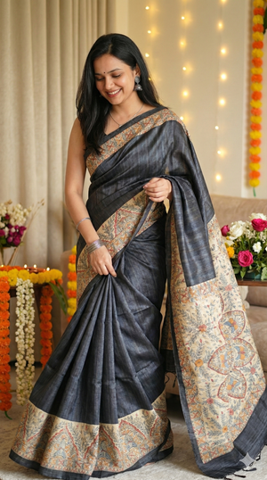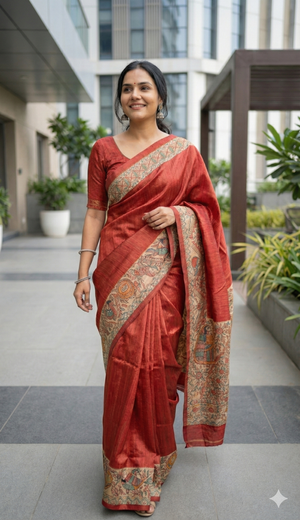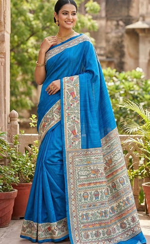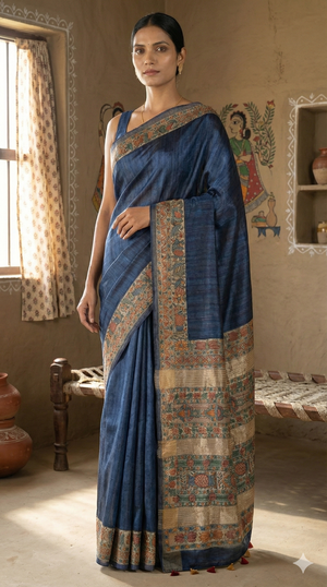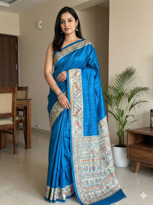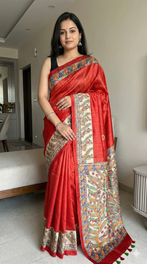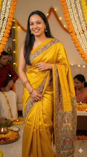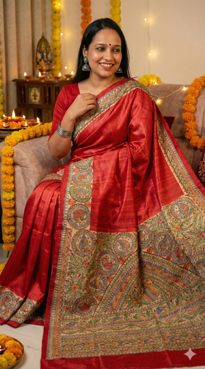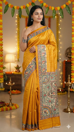 Madhubani painting sarees represent the living evolution of Mithila art, where storytelling moves beyond walls and paper onto handwoven fabric. These sarees are not printed textiles—they are hand-painted artworks, created slowly and intentionally, carrying forward a visual language that has flourished in Bihar for centuries.