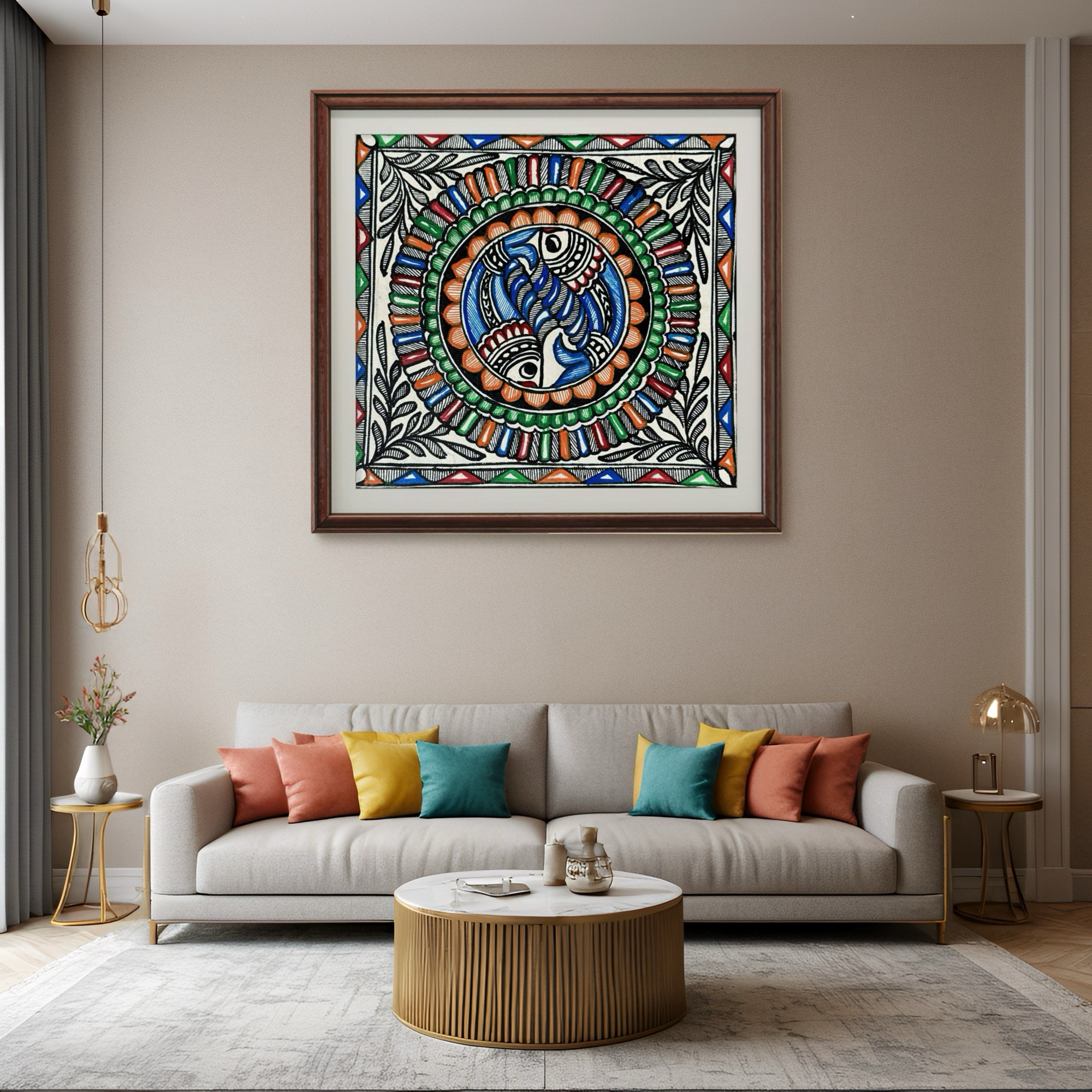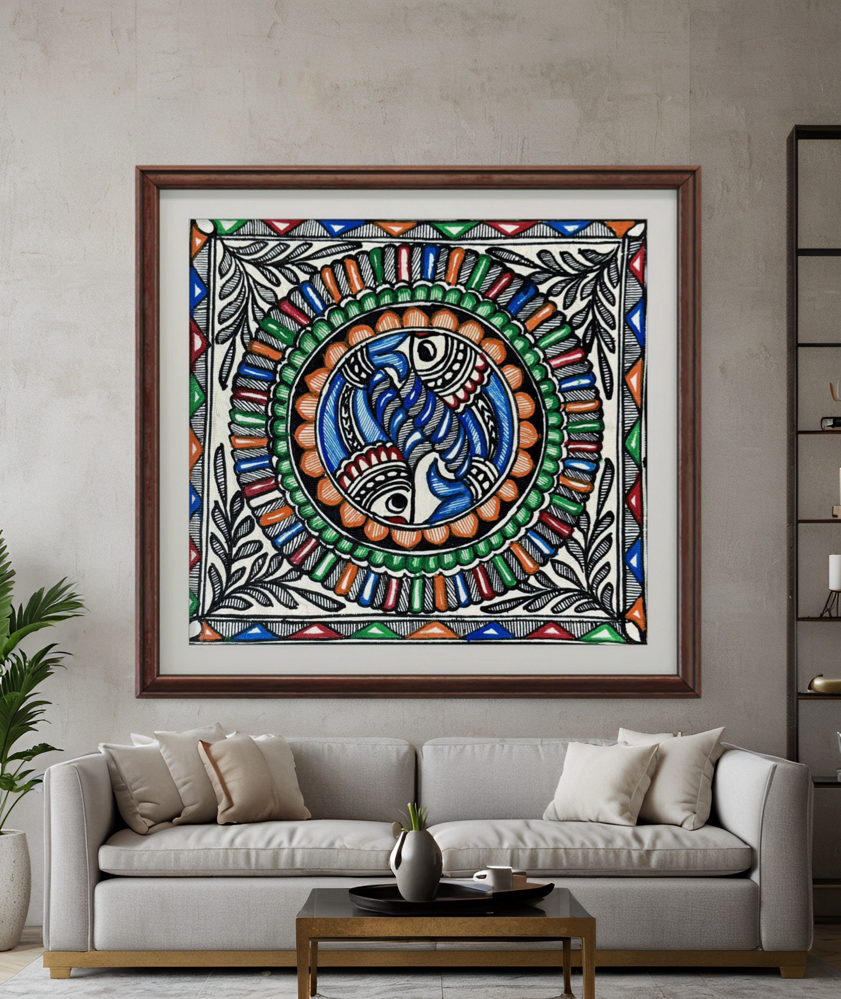 This exquisite Madhubani painting portrays a pair of fish, a traditional symbol of prosperity, fertility, and good fortune in Mithila culture. The fish are intricately rendered in vivid blues, encircled by concentric decorative bands in orange, green, and red, emphasizing the cycle of life and continuity. Surrounded by ornate floral motifs and bold geometric borders, this piece showcases the meticulous linework and vibrant symmetry characteristic of the Madhubani art form. A harmonious blend of nature and symbolism, this artwork is a radiant expression of cultural identity, ideal for adding a touch of heritage and color to any space.