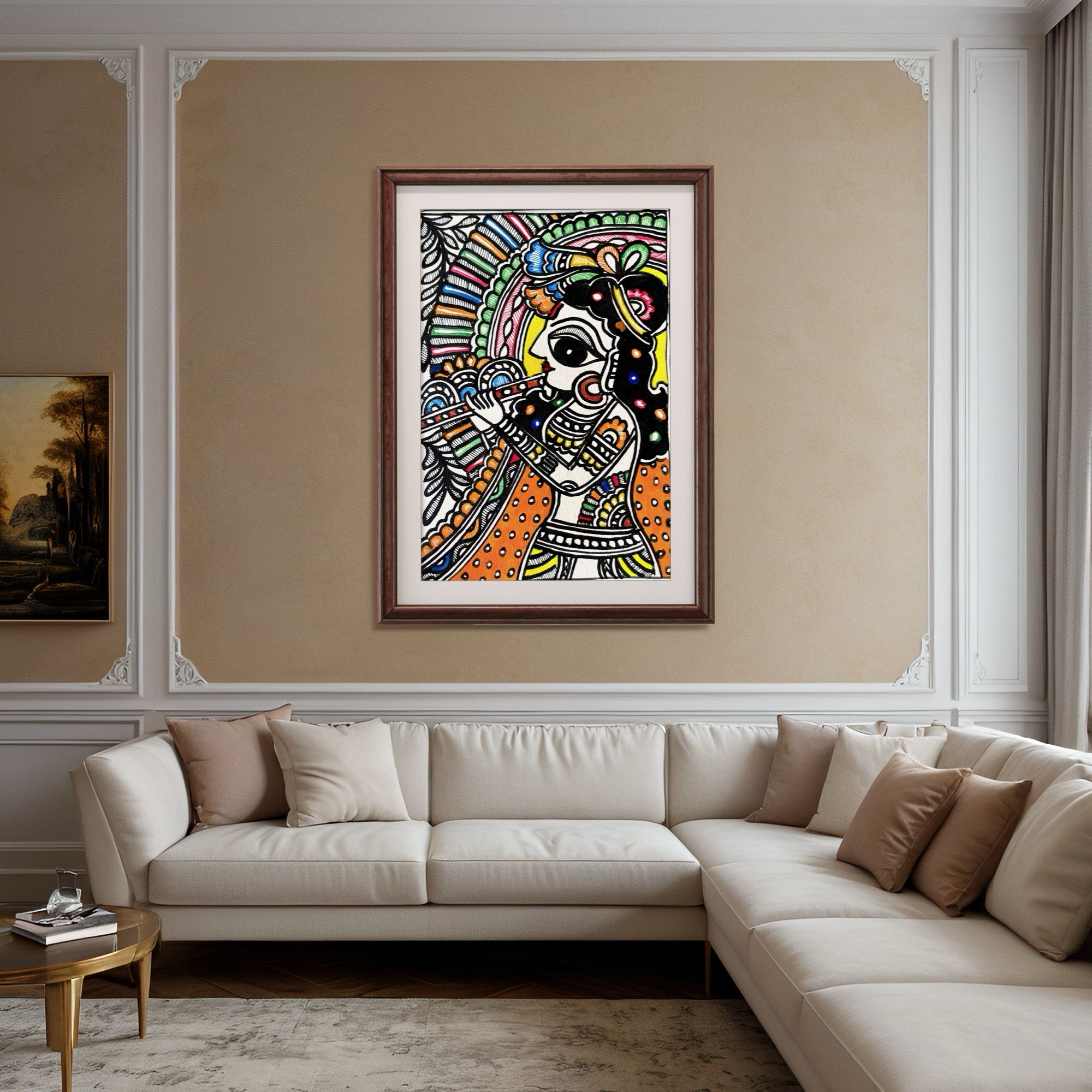 The artist has captured Krishna in vibrant attire, with fine detailing on ornaments, peacock-feather headgear, and expressive eyes. Bold outlines, rhythmic patterns, and a radiant orange backdrop create a lively and devotional aura, hallmarks of the Mithila painting tradition.