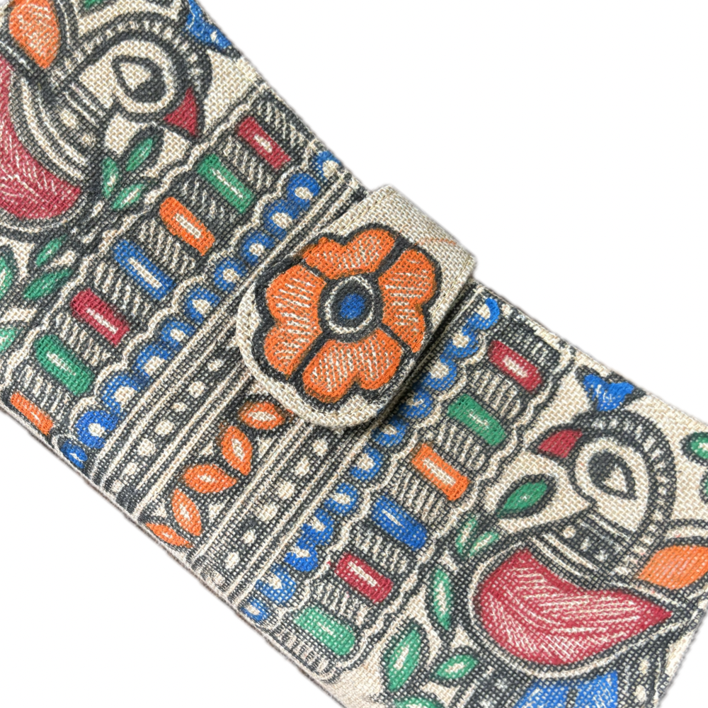 This elegant clutch bag is hand-painted with Madhubani Mor (peacock) motifs, symbolizing beauty, grace, and prosperity. The design also incorporates vibrant floral patterns in red, blue, green, and orange hues, framed by symmetrical borders that reflect the precision of Mithila folk art.
