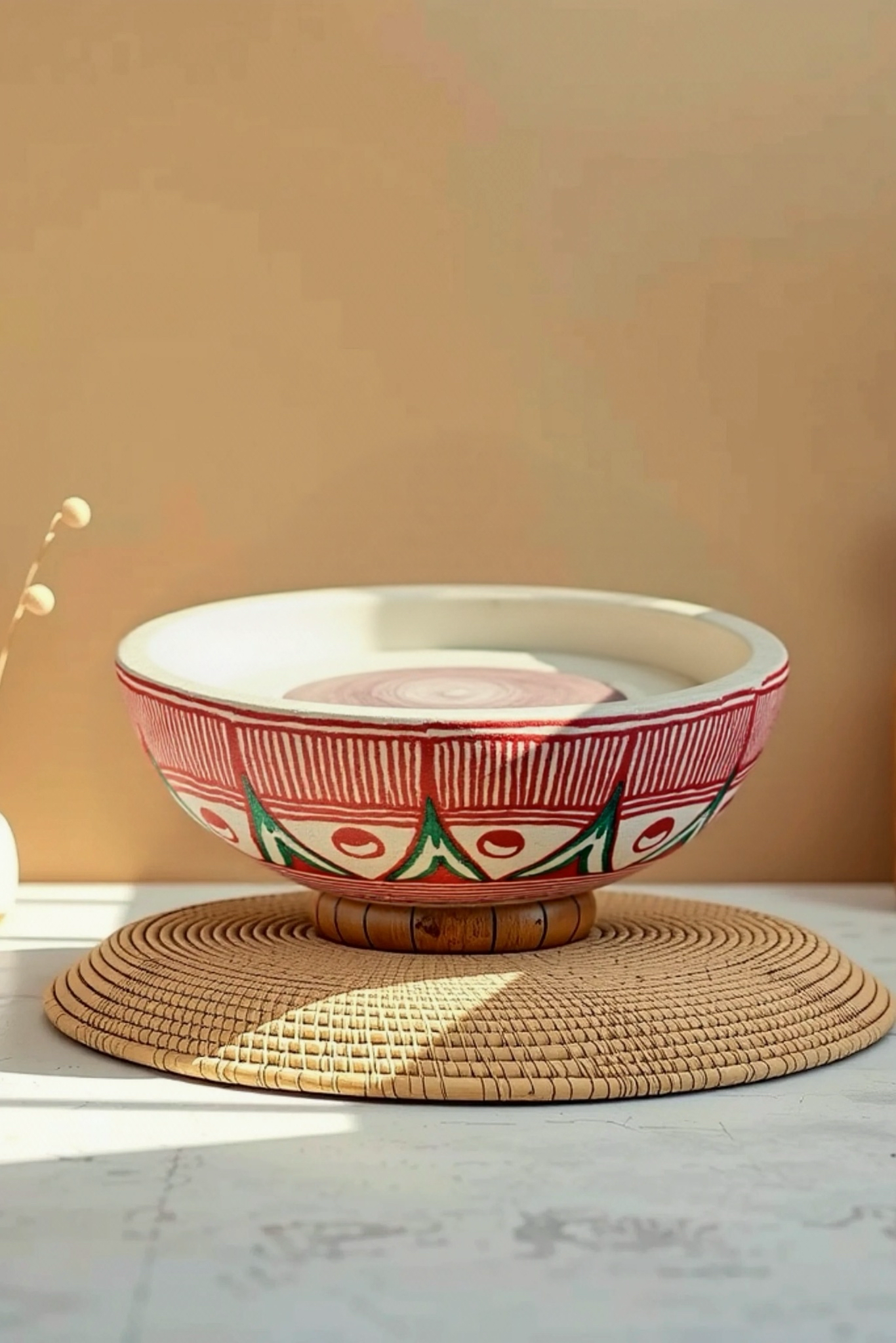 This handmade wooden kathauti is adorned with intricate Madhubani painting, featuring bold red borders, fine linework, and symbolic motifs inspired by Mithila tradition. Traditionally used in rituals and daily village life, the kathauti now makes a beautiful centerpiece, serving tray, or decorative bowl. Each piece is unique, eco-friendly, and crafted by skilled artisans, making it a perfect collectible for those who value culture and sustainability.