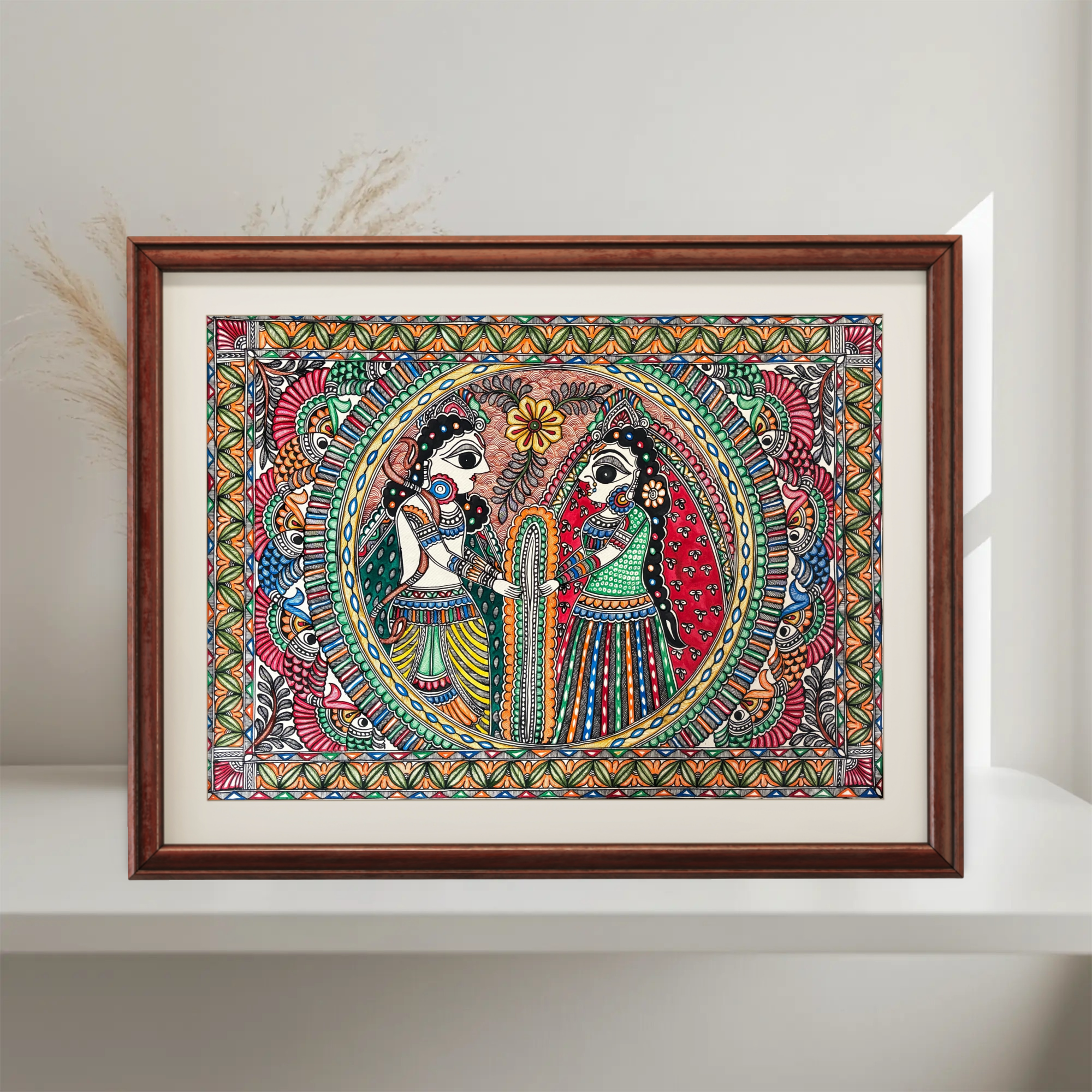 The artist has skillfully illustrated Ram and Sita exchanging garlands, surrounded by ornate floral and geometric patterns typical of the Mithila tradition. Bold outlines, symmetrical detailing, and rich natural pigments make this artwork a striking example of the cultural depth of Madhubani art.