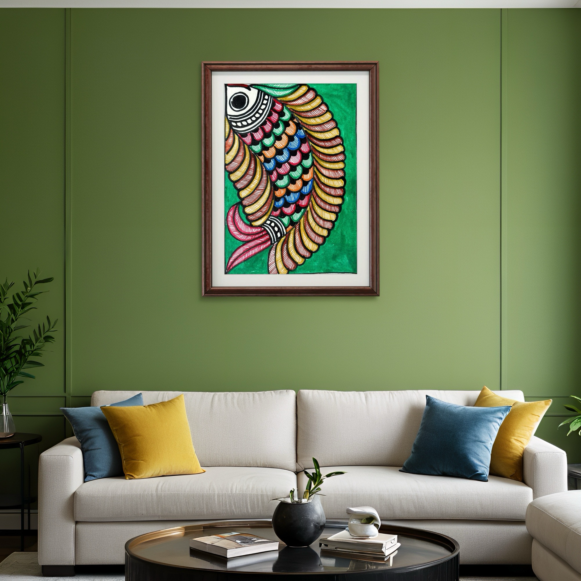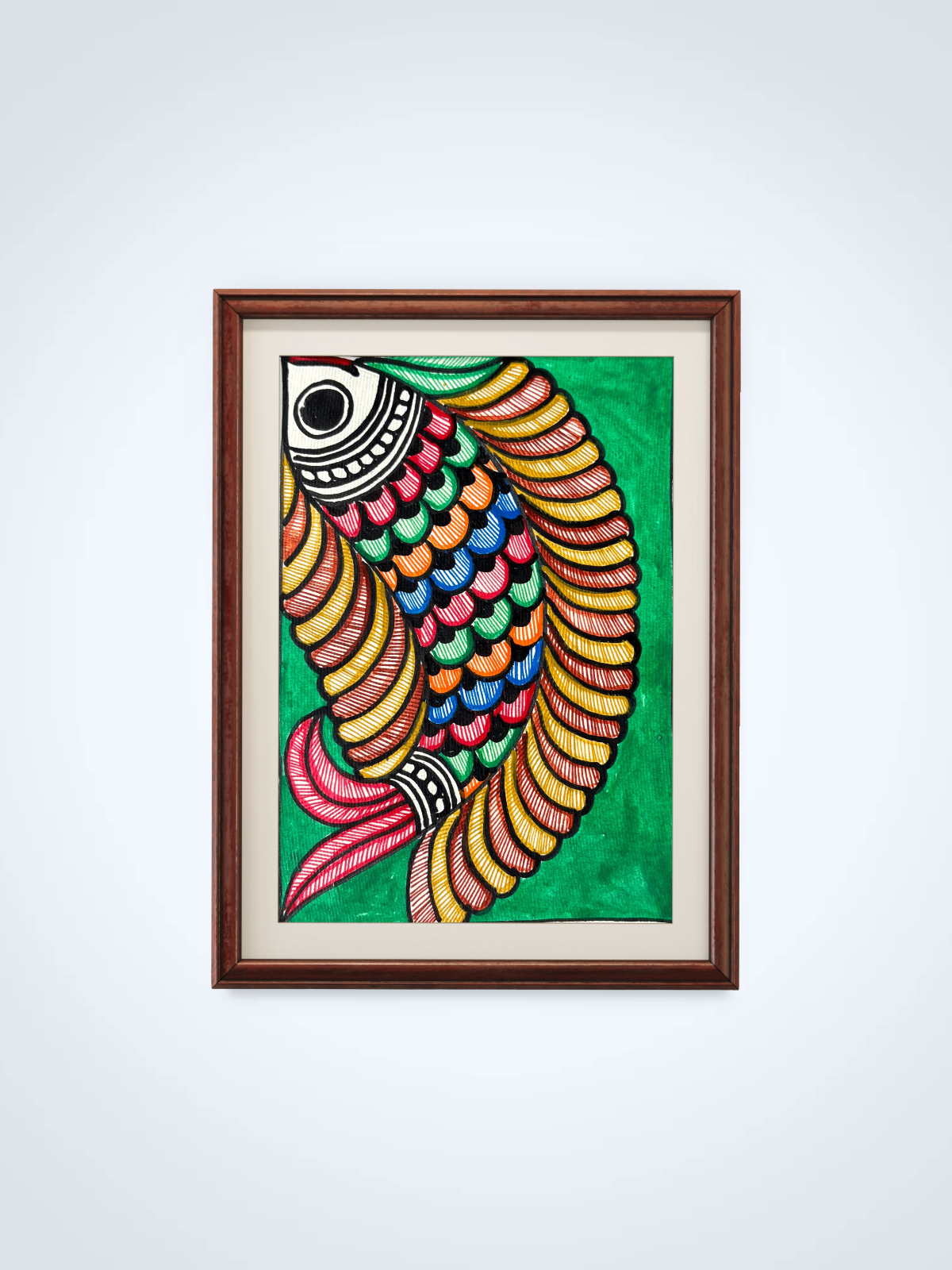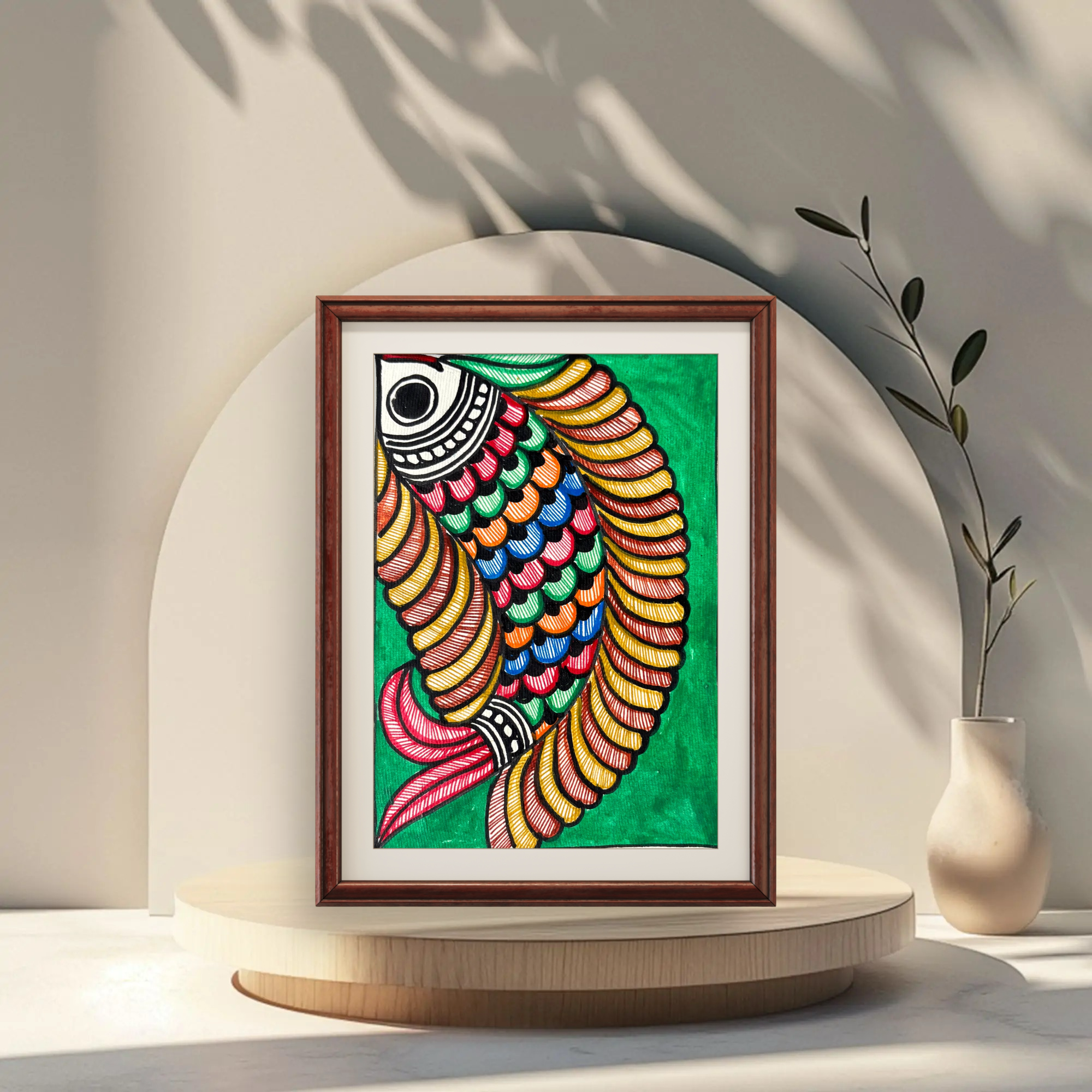 The composition features a single fish in a striking green background, accentuated with bright hues of red, yellow, blue, and orange. Each scale is painted with precision, while the ornamental patterns highlight the folk aesthetic of Madhubani art. The simplicity of the subject is elevated by the richness of its colors and design.