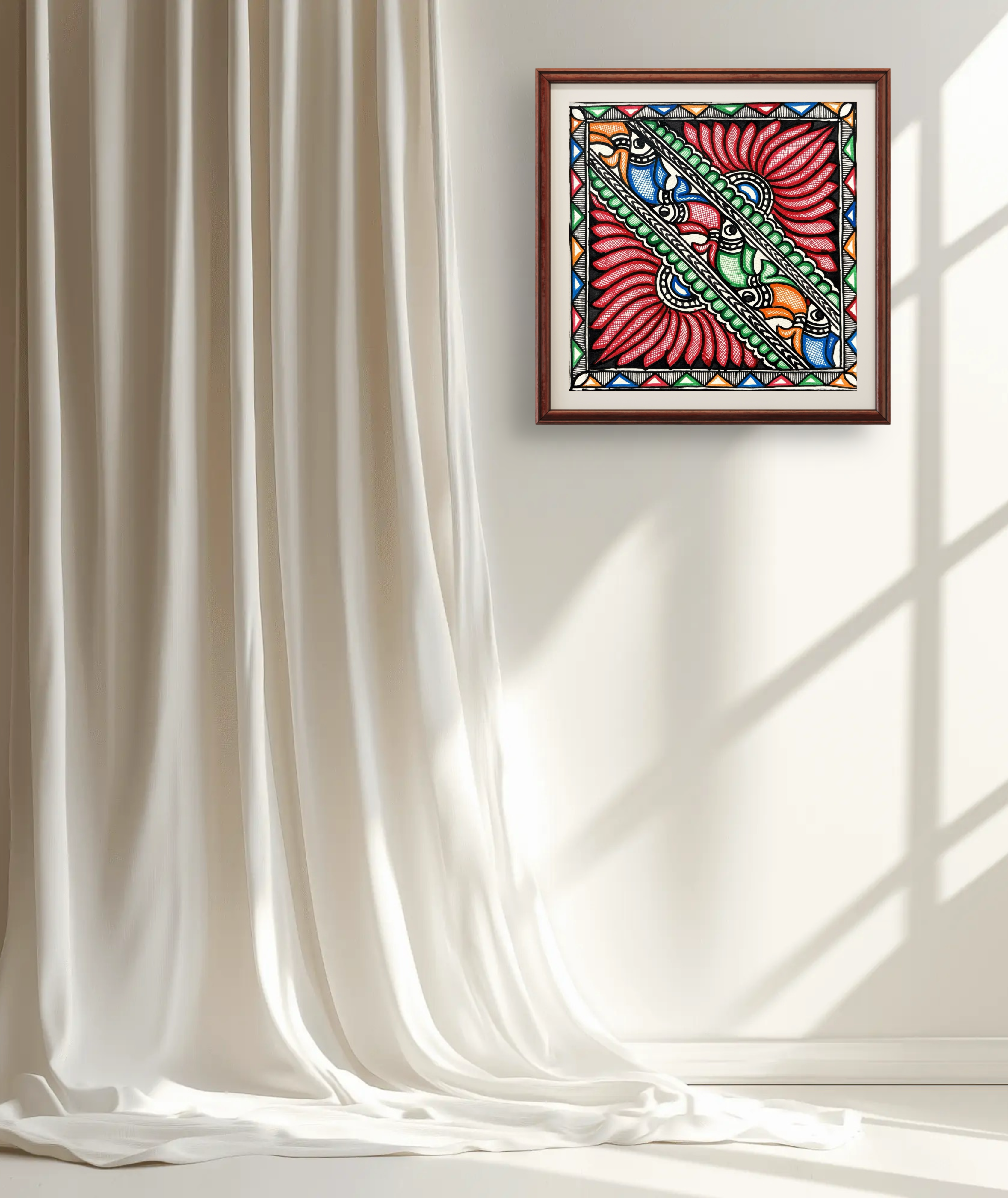 In Madhubani art, the peacock is often shown alongside blooming lotuses, signifying abundance, prosperity, and the celebration of life. The artist has used intricate detailing, vibrant colors, and traditional borders to highlight the richness of Mithila’s folk heritage. This artwork not only adds charm and elegance to a space but also carries auspicious meaning, making it a timeless piece for both cultural and aesthetic appreciation.