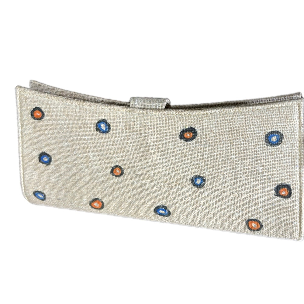This arc-shaped clutch bag is hand-painted with traditional Madhubani art, featuring floral motifs, symmetrical arches, and intricate borders in shades of red, green, blue, and orange. The design symbolizes celebration, prosperity, and harmony—hallmarks of Mithila’s cultural tradition.