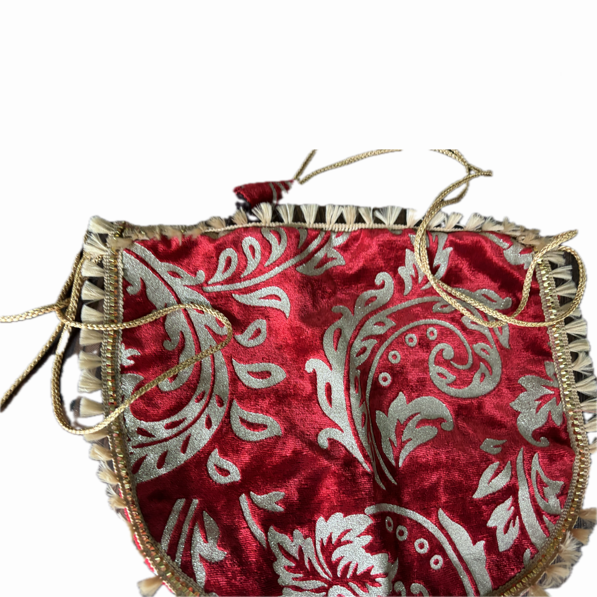 The Khoichha pouch is a cherished element of Mithila culture, symbolizing love, blessings, and prosperity. Traditionally used in weddings and festive rituals to gift shagun (auspicious offerings), this handcrafted pouch combines velvety red fabric with intricate golden designs, exuding elegance and heritage charm.