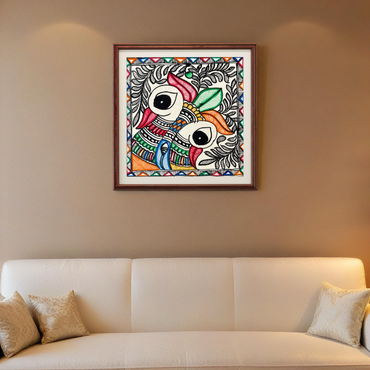 In Madhubani tradition, the peacock is often linked to romance, fertility, and spiritual awakening, making it a powerful motif of auspiciousness and joy. The intricate detailing, natural colors, and ornamental borders give this artwork a striking presence, perfect for adding both cultural richness and aesthetic vibrancy to any space.